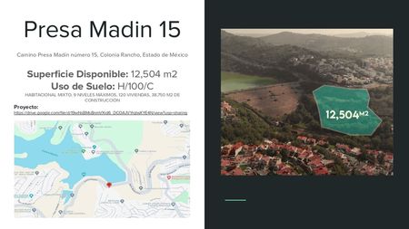EXCELENTE TERRENO PARA DESARROLLADORES O INVERSIONISTA PARA DESARROLLO DE DEPARTAMENTOS DE INTERES SOCIAL O INTERES MEDIO , UBICADO EN CAMINO A PRESA MADIN NO. 15, COLONIA RANCHO CASTRO, MUNICIPIO DE ATIZAPAN DE ZARAGOZA, CON UNA SUPERFICIE DE 12,503.66 MT2 PRECIO DE SALIDA $99,000.000.00 (NOVENTA Y NUEVE MILLONES DE PESOS 00/100 M.N)